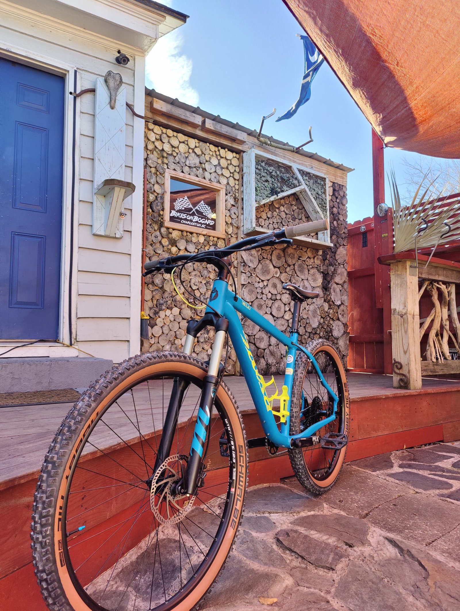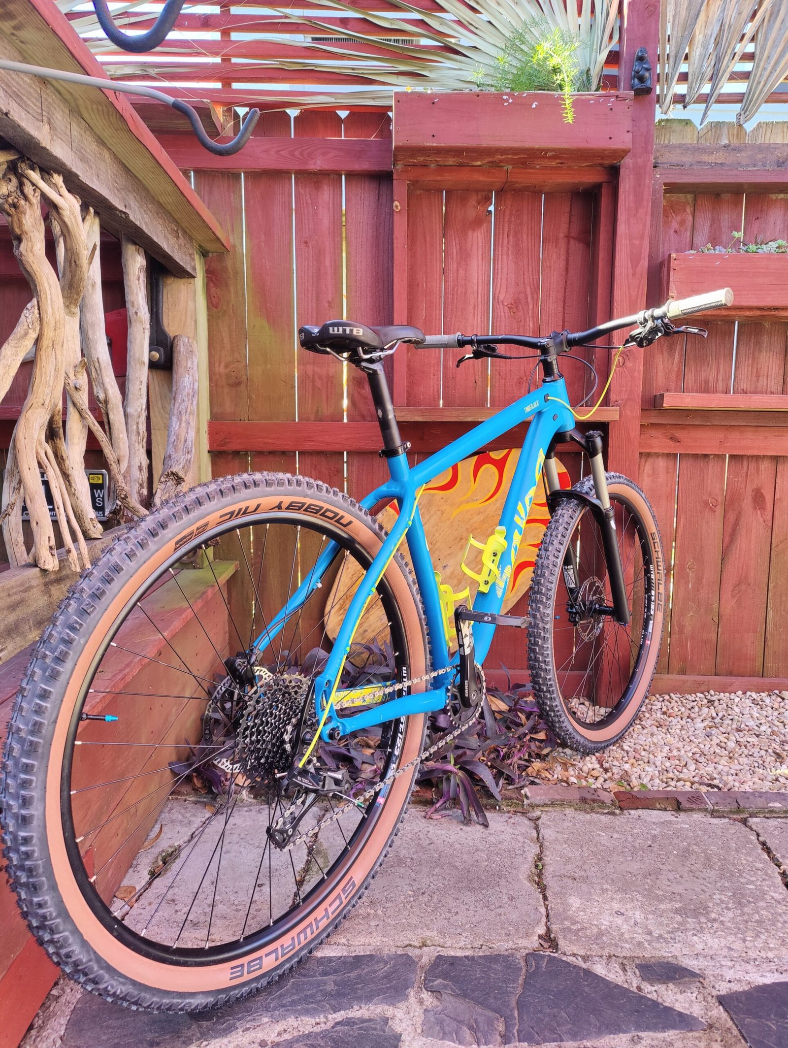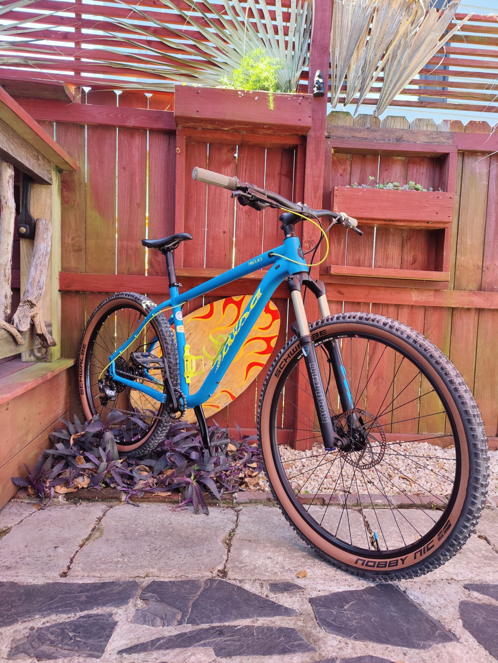 Freshly tubeless Schwalbe Nobby Nick zero miles WTB saddle Crank Bros Stamp 1 pedals Manitou fork Hell’s gate grips